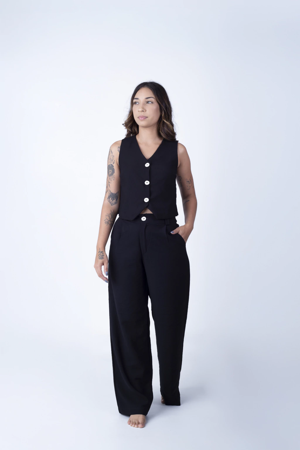 Calça Jade traz sofisticação e conforto, com modelagem pantalona e cós estruturado, sem elástico nas costas. Seu fechamento frontal com colchete e zíper, além dos passantes para cinto e bolsos frontais, garantem um visual elegante e prático. De cintura alta/média, a peça também pode ser usada como cintura baixa ao optar por um tamanho maior. Feita em viscose com poliéster, a calça tem excelente caimento e resistência, ideal para quem busca estilo e durabilidade. Peças na cor Off White possuem forro invisível, proporcionando mais segurança e conforto sem interferir no design minimalista da peça.